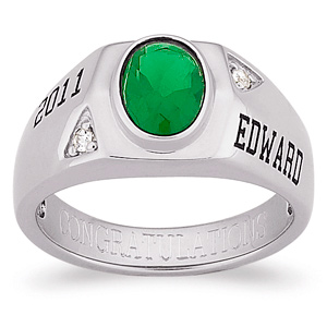 The boy's Varsity class ring is set with an 8mm x 6mm oval shaped Austrian crystal. The Varsity class ring is made of polished Celebrium. Engrave it your graduation year, your name, school name or custom messages. Choose two engravings (up to 10 letters) and inside personal engraving (up to 15 letters]. All engravings are in capital letters. Made in USA.
