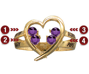 The Family Heart ring features personalization for 2 to 6 names and corresponding birthstones. Stones are 2.25 mm round. Engrave up to 7 characters per name. It is available with either simulated or genuine birthstones. Choose between 10K or 14K yellow or white gold.