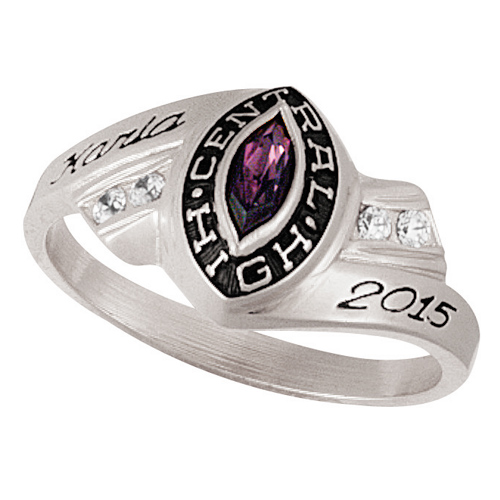 The school name surrounds the marquise cut stone on the 18kt white gold Danielle class ring. Personalize the ring with your name, school name or graduation year. Choose diamond or cubic zirconia side stones. Ring is handcrafted in the USA by Gold Lance.