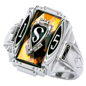 The men's 10k white gold Emperor class ring features your initials on the ring sides. A school crest and two-digit graduation year accent the top. Solid back ring is handcrafted in the USA by Gold Lance. The top bezel of the Emperor style boy's ring measures 15mm x 7mm.