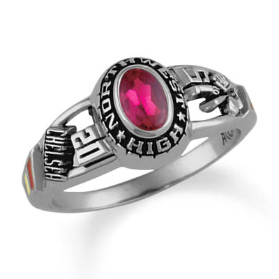 The ladies' siladium Tempo class ring splits the graduation year across its sides. School colors appear below the side emblems you choose. Siladium is comparable to fine jeweler's stainless steel, with a bright silver tone. Contains 12% nickel. Ring top width: 9.6mm, palm width: 1.9mm. Enjoy ArtCarved's limited lifetime warranty. Import.