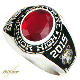 The boys junior high school class ring design in 10kt white gold features an 8mm x 6mm oval stone and allows many opportunities for personalization. Personalize this class ring with your choice of activity, school mascot, name and graduation year. The ring is handcrafted in the USA by Gold Lance.