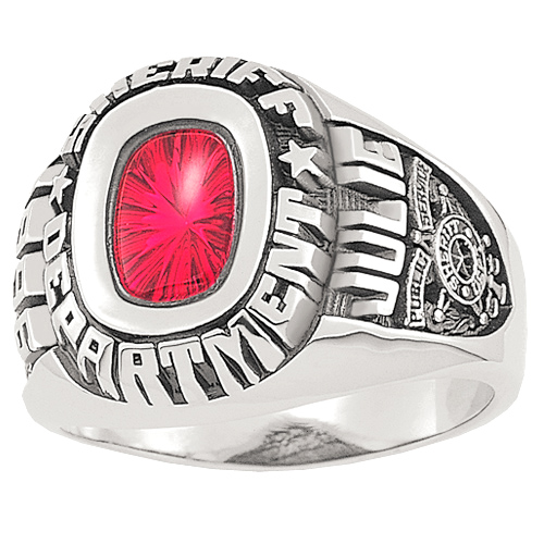 The 14kt white gold Patriot police ring for women offers your choice of engravings and stone color. This ring offers the standard wording POLICE DEPARTMENT on the outer bezel. Solid back ring is handcrafted by ArtCarved. Enjoy ArtCarved's limited lifetime warranty. Ring top width: 13.5mm, palm width: 3.5mm.