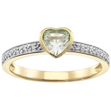 The 10kt yellow gold heart stacking ring is set with a 5mm heart shaped gemstone and 12 x .5pt cubic zirconia accent stones. The ring is 2.5mm at the top and tapers to 2.2mm. This style is available in whole and half finger sizes, 4-10. Standard fit.
