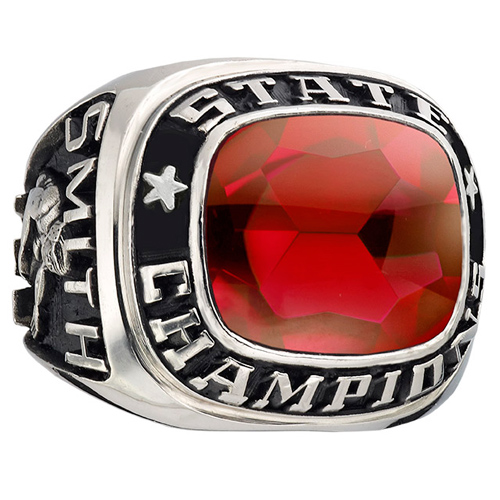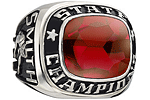 The men's Bravura championship ring is a large ring and features a 16mm x 14mm simulated stone. Choose stone color, wording around the stone, and side emblems. This ring is handcrafted in the USA by Gold Lance.