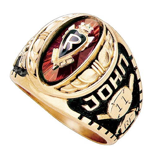 Crowned with a ring of laurel leaves, the boys' Royal Scepter class ring style features a school letter crest on a unique oval stone cut. Add your choice of activity panels, school mascot, name or graduation year. This solid back ring is handcrafted in the USA by Gold Lance.