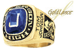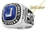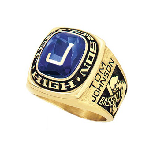 The MVP is a large boys' class ring and features a 13mm x 11mm oblong simulated stone. Personalize it with your choice of favorite activity, school mascot, name and graduation year. Solid back ring is handcrafted in the USA by Gold Lance.