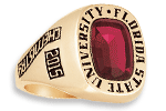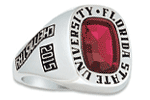 The men's Contemporary college ring offers a modern look. The school name appears around the 12mm x 9mm oblong stone. Personalize side engravings and the stone color. This solid back ring is handcrafted in the USA by Gold Lance.