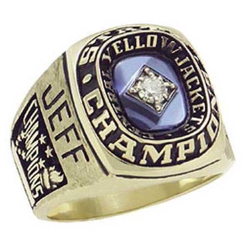 The Endurance championship ring features a 12mm x 10mm simulated stone. Solid back ring is handcrafted in the USA by Gold Lance. Minimum order quantity is 25. Personalize it with your choice of favorite activity, school mascot, name and graduation year. This design is available with year date with diamonds.
