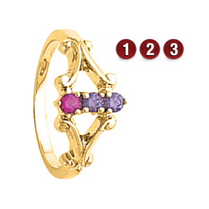 This ring features personalization for 3 round birthstones. Each bezel-set gemstone is 3.0mm in diameter. Choose simulated or genuine birthstones, 14kt yellow or white gold.