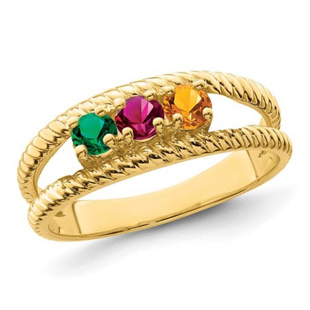 Make an elegant statement with this 14kt gold ring. This ring features personalization for 3 birthstones. Each prong-set gemstone is 3.0mm in diameter. It is available with simulated or genuine birthstones. Weight: 4.05 grams.
