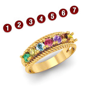 Make an elegant statement with this 14kt gold ring. This ring features personalization for 7 birthstones. Each prong-set gemstone is 3.0mm in diameter. It is available with simulated or genuine birthstones. Weight: 4.82 grams.
