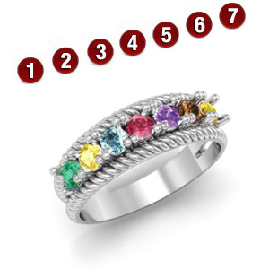 Make an elegant statement with this 14kt gold ring. This ring features personalization for 7 birthstones. Each prong-set gemstone is 3.0mm in diameter. It is available with simulated or genuine birthstones. Weight: 5.38 grams.
