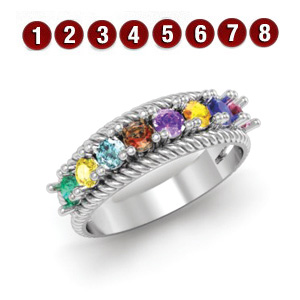Make an elegant statement with this 14kt gold ring. This ring features personalization for 8 birthstones. Each prong-set gemstone is 3.0mm in diameter. It is available with simulated or genuine birthstones. Weight: 4.9 grams.