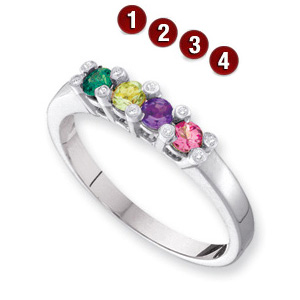Choose polished 14k white or yellow gold. This ring offers stone personalization for 1-4 round gemstones. Each prong-set gemstone is 2.75mm in diameter. Choose simulated or genuine gemstones. Made in USA. Both genuine and simulated stone rings have diamond accent stones [.03 ct tw, I1 clarity, G-I color].