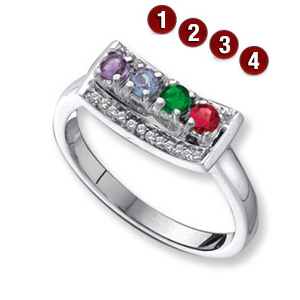 Polished 14k white gold only. This ring offers stone personalization for 1-4 round gemstones. Each prong-set gemstone is 2.75mm in diameter. Choose simulated or genuine gemstones. Made in USA. Both genuine and simulated stone rings have diamond accent stones .06 ct tw [ I1 clarity, G-I color]. Diamond accent stones sit in a curved shank.