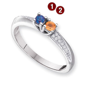 Choose polished 14k yellow or white gold only. This ring offers stone personalization for 1-4 round gemstones. Each prong-set gemstone is 2.75mm in diameter. Choose simulated or genuine gemstones. Made in USA. Both genuine and simulated stone rings have diamond accent stones [ I1 clarity, G-I color]. Weight: 2 grams, 0.05 diamond ct tw.