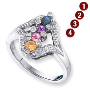 Choose polished 14k yellow or white gold. This ring offers stone personalization for 1-4 round gemstones. Each prong-set gemstone is 2.75mm in diameter. Choose simulated or genuine gemstones. Made in USA. Both genuine and simulated stone rings have .07 ct tw diamond accent stones [ I1 clarity, G-I color]. Approximate weight: 3.25 grams.