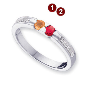 Choose polished 14k white or yellow gold only. This ring offers stone personalization for 1-4 round gemstones. Each gemstone is 3.0mm in diameter. Shared prongs. Choose simulated or genuine gemstones. Made in USA. Both genuine and simulated stone rings have .04 ct tw diamond accent stones [ I1 clarity, G-I color]. Weight: 2.57 grams.