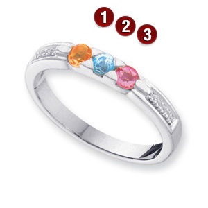 Choose polished 14k white or yellow gold only. This ring offers stone personalization for 1-4 round gemstones. Each gemstone is 3.0mm in diameter. Shared prongs. Choose simulated or genuine gemstones. Made in USA. Both genuine and simulated stone rings have diamond accent stones [.03 ct tw, I1 clarity, G-I color]. Weight: 2.63 grams.