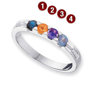 Choose polished 14k white or yellow gold only. This ring offers stone personalization for 1-4 round gemstones. Each gemstone is 3.0mm in diameter. Shared prongs. Choose simulated or genuine gemstones. Made in USA. Both genuine and simulated stone rings have .02 ct tw diamond accent stones [ I1 clarity, G-I color]. Weight: 2.49 grams.