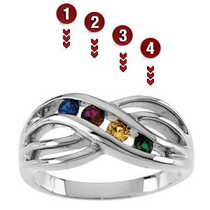 The sterling silver Sloping Twist mother's ring features four genuine 2.5mm round gemstones of your choice. Channel set stones. Import.