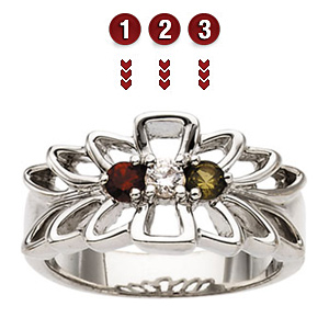 Make an elegant statement with this family ring. Each prong-set gemstone is 3mm in diameter. It is available with simulated or genuine birthstones. Sterling silver only.