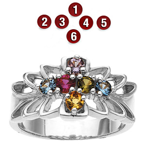 Make an elegant statement with this family ring. Each prong-set gemstone is 3mm in diameter. It is available with simulated or genuine birthstones. Sterling silver only.
