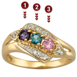 The 10kt yellow gold Enchanting mother's ring is set with three simulated 3mm round birthstones of your choice. Cubic zirconia accents decorate the ring. Import.