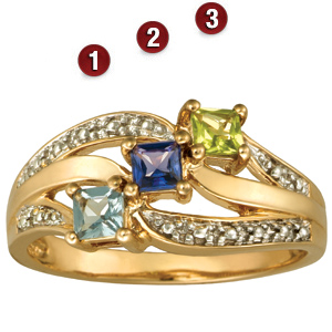 The 10kt yellow gold Shine mother's ring is set with three 3mm x 3mm princess cut genuine gemstones. Select the color for each gemstone. Accented with metal beading. Import.