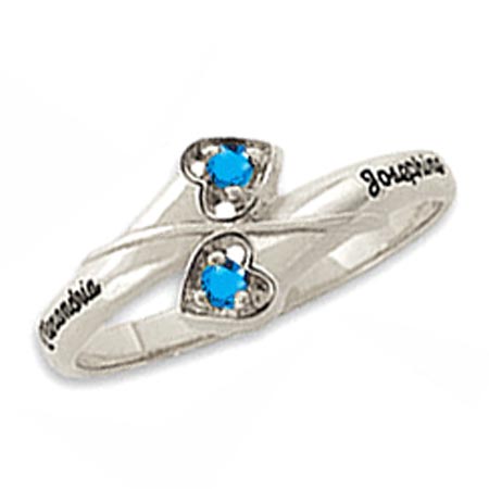The sterling silver Delightful Hearts promise ring is set with two genuine gemstones. Engrave two names, up to 10 characters each. Each round gemstone is 2mm in diameter (equivalent to .04 ct). Import.
