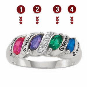 Sterling silver songs of life mother's ring has four simulated marquise cut 6mm x 3mm birth stones and a band of accented cubic zirconias. Five 1.3mm round cubic zirconia accent stones. Each engraving area fits up to 10 characters, including spaces and punctuation. Import.