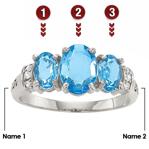 The sterling silver Reverie ring is set with three oval simulated gemstones: one 8x6mm, and two 6x4mm stones. Six 1.3mm round cubic zirconia accent stones. Engraving areas 1 and 2 accommodate up to 10 characters. Import.
