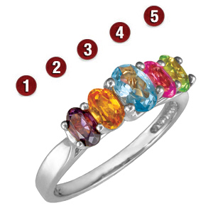 Celebrate your loved ones and memories with this elegant Garland ring. Sparkling oval stones share prongs on this instant family heirloom. Stone details: 4 - 5x3mm oval; 1 - 6x4mm oval center stone for Mom. Available with simulated or genuine birthstones.