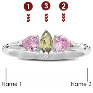 Mother's marquise center gemstone 6x3mm is flanked by two 4x4mm heart shaped gemstones. Engrave up to 10 characters per engraving area. Available with simulated or genuine birthstones. This ring is always set with three gemstones.