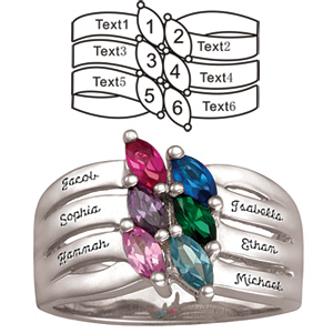 Choose six marquise cut simulated birthstones and engravings for the sterling silver Honor mother's ring. Each prong set gemstone is 5mm x 2.5mm. Engrave up to 12 characters per engraving area. Import.