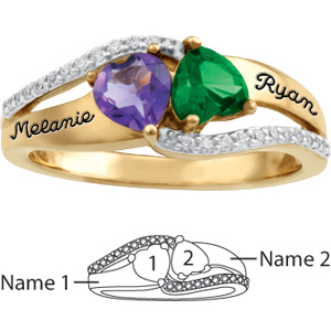 The 10kt yellow gold Sweet Promise promise ring is set with two 5mm heart shaped birthstones of your choosing. Engrave up to 12 characters in each of two engraving areas. Top width: 7.6mm, palm width: 2.2mm. Imported.