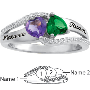 The 14kt white gold Sweet Promise promise ring is set with two 5mm heart shaped birthstones of your choosing. Engrave up to 12 characters in each of two engraving areas. Top width: 7.6mm, palm width: 2.2mm. Imported.
