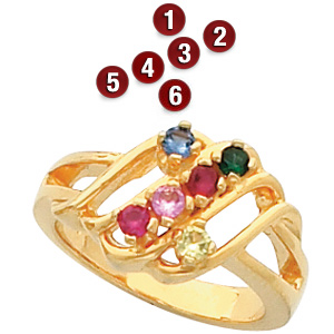 Gorgeous loops of gold! This ring features personalization for 1-6 birthstones. Each prong-set gemstone is 2.5mm in diameter. It is available with simulated or genuine birthstones. Choose 14kt yellow or white gold only.