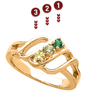 Gorgeous loops of gold! This ring features personalization for 1-6 birthstones. Each prong-set gemstone is 2.5mm in diameter. It is available with simulated or genuine birthstones. Choose 14kt yellow or white gold only.