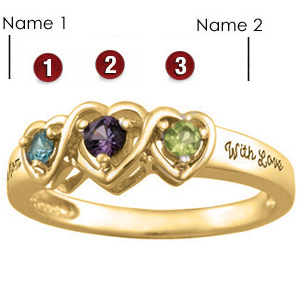 Choose colors for three genuine round gemstones surrounded by entwined hearts. The gold-plated sterilng silver Entwined ring has two engraving areas. Each engraving area can accommodate up to 10 characters. Two 2.5mm round and one 3mm round center stone. Import.