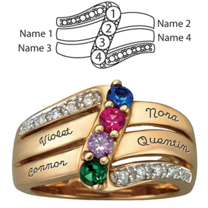 The gold-plated sterling silver Luxe mother's ring is set with four simulated 3mm round brilliant gemstones. Four 1mm round and six 1.25mm cubic zirconia accent stones. Engraving areas accommodate up to 12 characters, including spaces and punctuation.