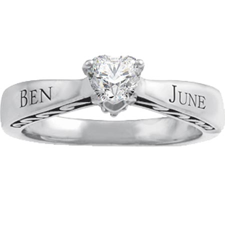 The 14kt white gold Bonded ring features a 5mm heart shaped created sapphire and two names. Two 1.75mm round created sapphire accent stones are set beneath the center stone. Engrave up to 12 characters per name. Engravings are always in capital letters. Top width: 5.5mm, palm width: 2.5mm. Import.