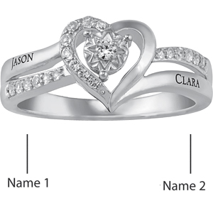 The 10kt white gold heart shaped Sincere ring features a 2mm round created sapphire and two names of your choice. Accent stone details: 12 x 1.25mm and 8 x 1mm round stones decorate the shank. Engrave up to 12 characters per name. Engravings are always in capital letters. Top width: 9mm, palm width: 2.25mm. Import.