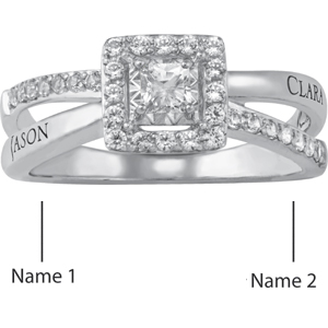 The 10kt white gold Romantic ring features a 3mm square brilliant created sapphire and two names. 30 x 1.25mm round created sapphire accent stones are set in the bypass style shank. Engrave up to 12 characters per name. Engravings are always in capital letters. Top width: 7.5mm, palm width: 2mm. Import.