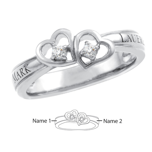 The 14kt white gold Fascination ring has two nestled hearts adorned with two 2mm round created sapphires and two names. Engrave up to 12 characters per name. Engravings are always in capital letters. Top width: 6.2mm, palm width: 3.7mm. Import.