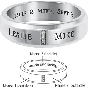 The men's 10kt white gold Devoted commitment band has three 1mm round created sapphires and two names. Engrave up to 12 characters per name on the outside of the ring. Select an inside engraving as well. Engravings are always in capital letters. Ring width: 6.75mm. Import.