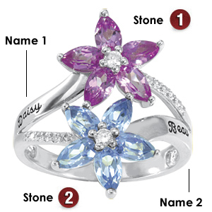The 10kt white gold Floret promise ring has two clusters of simulated pear-shaped gemstones [5mm x 3mm]. Round brilliant accent stones: 12 x 1mm. Engraving areas 1 and 2 fit up to 12 characters, including spaces and punctuation. Import.