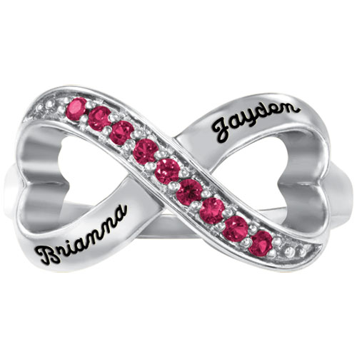 The Perpetual promise ring in 14k white gold combines the infinity symbol and two hearts. Personalize it with engravings and birthstones. Choose the color for a ribbon of nine 1.5mm round simulated birthstones. Each engraving area fits up to 12 characters. Ring top width: 10mm. Import.