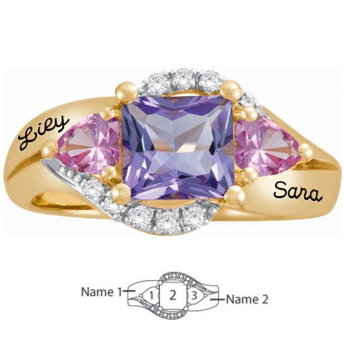 The Twinkle promise ring with genuine gemstones is crafted in 14k yellow gold. It is set with a princess cut center stone, two heart shaped side stones, and two sweeping ribbons of cubic zirconia accents. Engrave up to 12 characters in each of two engraving areas. Ring top width: 11.3mm, palm width: 2.3mm. Imported.
